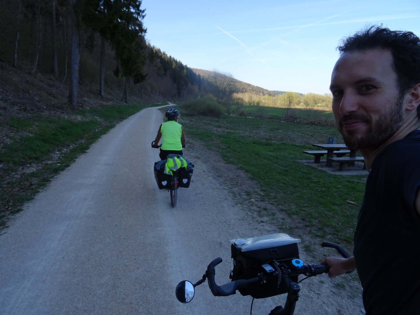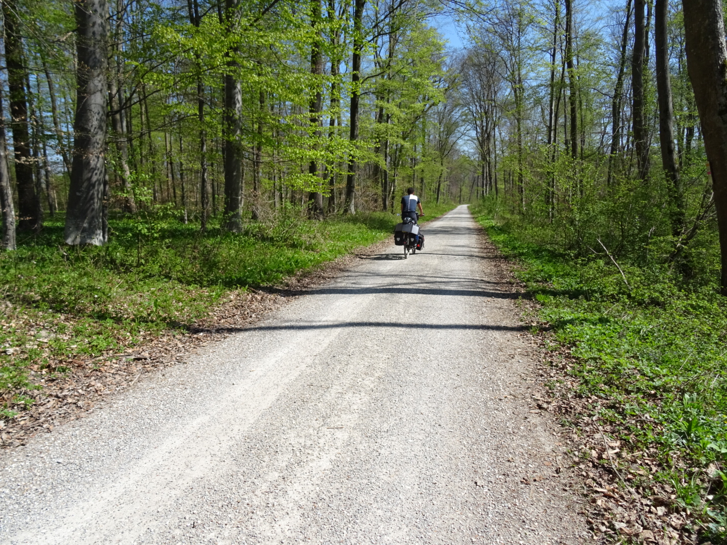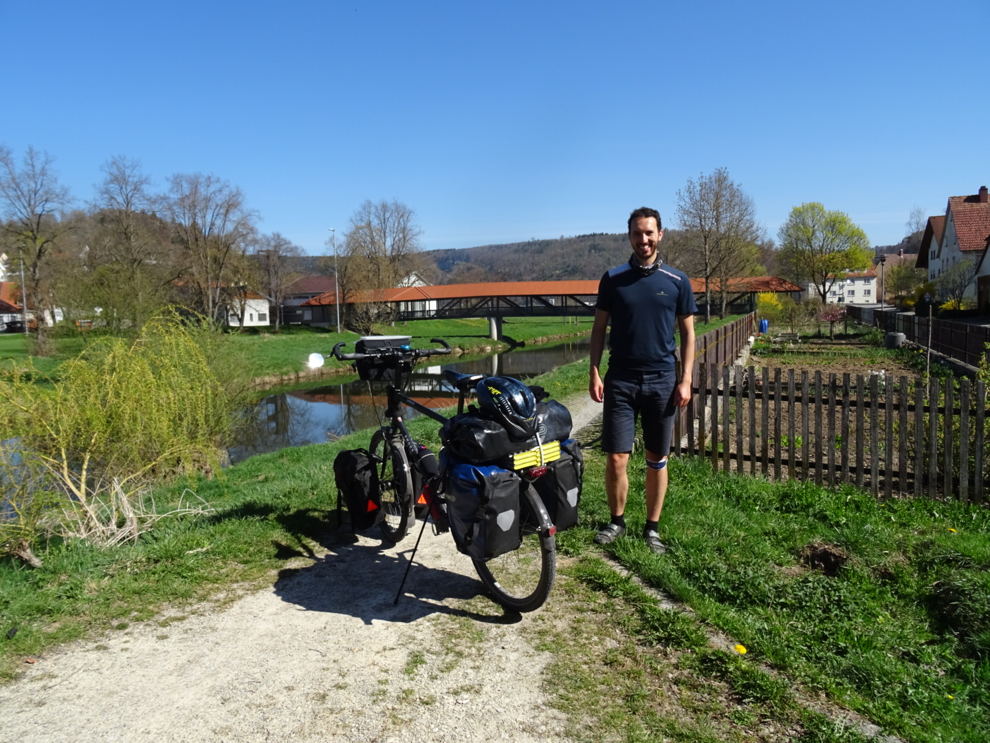 The German section of the route has been 580km in length, we’ve cycled it in just under a week I think. We’ve been aiming for around 50 miles/ 80km per day. We usually start moving by 9.30am and have multiple breaks, especially for lunch and shopping. Then look for a campspot at 6pm and are in our tents by 9pm/when the light has nearly faded.
