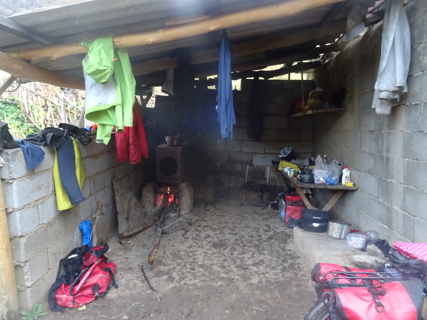 One day it was raining, after a few hours and negotiating large mud pools we collectively decided to stop and rest in an empty farmers building. Here we made a fire to warm up and dry our clothes.
