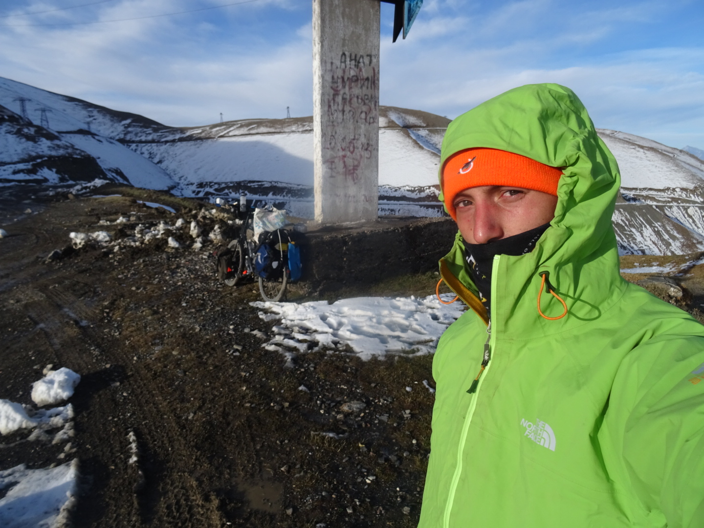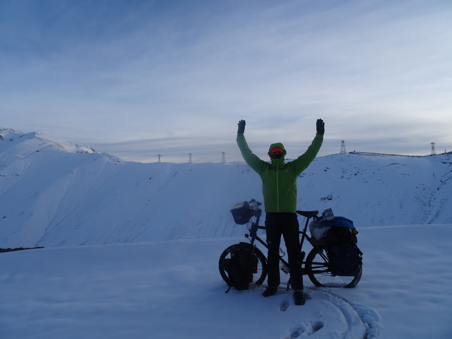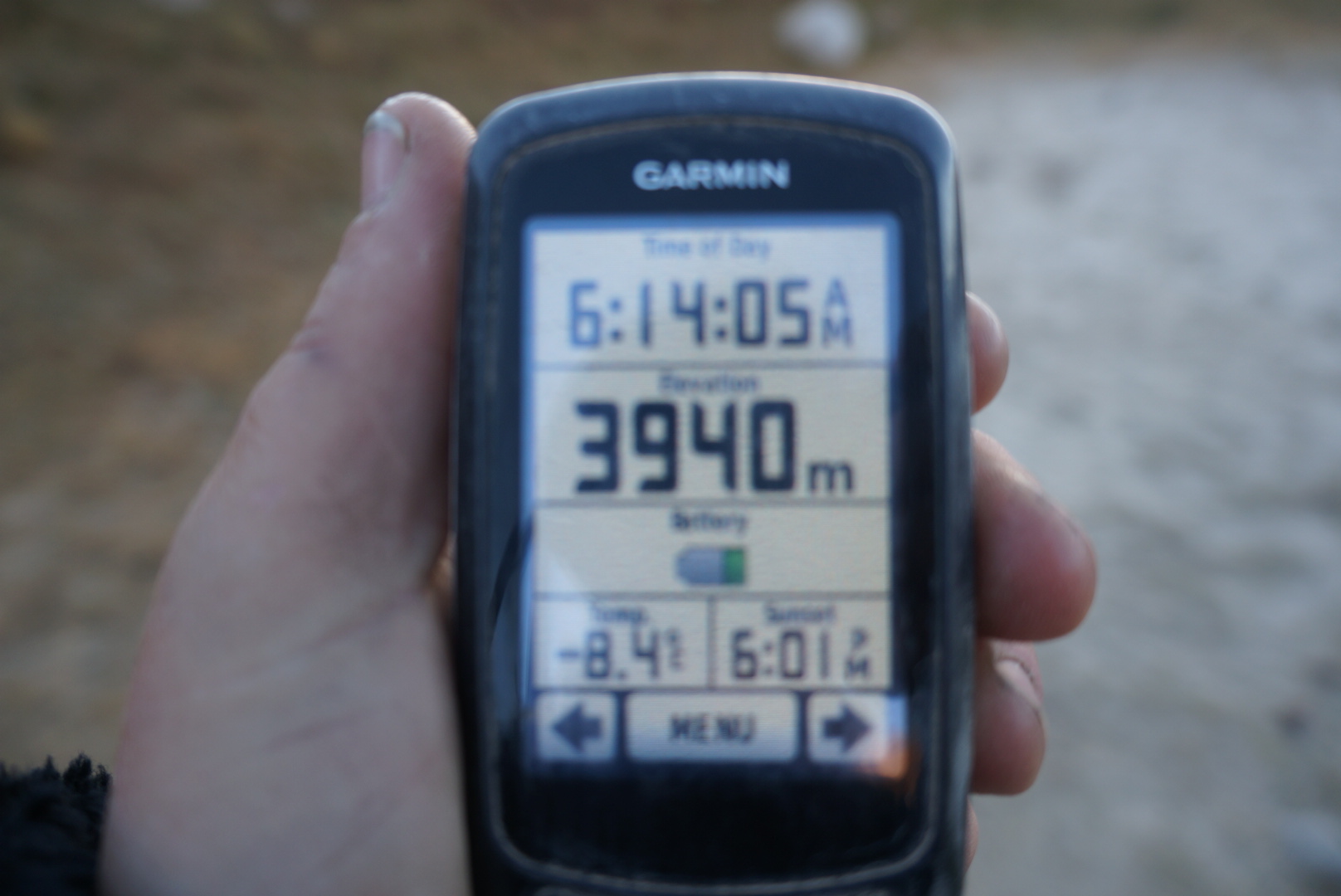 Bertrand and I reached the summit at 5pm, it was freezing cold. The water bottles on our bikes started to turn solid.